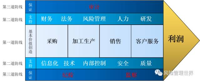 一谈到企业风险管理的“三道防线”概念。我们就会想到前些年企业进行全面风险管理体系建设时,经常提起的在组织机构层面建立企业风险管理的“三道防线”的做法,即企业的业务部门作为前端部门是风险管理的第一道防线;企业风险管理职能机构作为风险管理的第二道防线;企业的内部审计职能机构作为风险管理的第三道防线。 三道防线共同组成了企业风险管理的防线系统,中国企业前些年进行的风险管理体系建设主要内容,是以建设第二道防线为主,包括建立组织机构和工作机制,识别和评估包括整个风险管理防线系统的相关风险,作为第二道防线工作开展的基础。 下图是前些年我们对典型的三道防线组织架构图的理解。 在国际上,也有跟国内“三道防线”提法相对应的概念,即 Three Lines of Defense,也可以直译为三道防线。即第一道防线是Risk Owner (风险所有方),也是指业务单元或部门;第二道防线是Risk Management (风险管理), 前些年在风险管理理论还不太成熟时,也有称第二道防线是Risk Control and Compliance(风险控制与合规);第三道防线是Risk Assurance(风险保证),主要是指内部审计部门。 “三道防线”的概念到底是中国人先提出的还是国际上先出现的,我们还没有找到确凿的证据,如果是国际上先出现的,中国的三道防线的概念的提出是否是借鉴了国际经验,现在还不好下定论。 新版COSO在附录中也阐述了对于三道防线的概念,是从风险管理责任的角度论述的,谈到了首席执行官CEO、首席风险官CRO和管理层三个层面各自的风险责任。 同时,也阐述了风险管理责任落实的第一道防线是:核心业务部门(Core Business);第二道防线是:支持职能部门(Supporting Function);第三道防线是:保证职能部门(Assurance Function)。 核心业务部门:和我们前期提到的第一道防线的概念基本一致,即企业管理的前台部门,作为风险管理的第一责任机构; 支持职能部门:这部分作为第二道防线和前期的提法变化最大,支持职能部门除了包含风险管理专职职能之外,还包括:法务、合规、财务、人力、质量、安全等,所有可以协助一线核心业务部门进行风险管控的职能,都应该属于支持职能部门,即第二道防线; 保证职能部门:主要指的是审计部门,包括内部审计和外部审计。 其中和我们原来三道防线的提法变化最大的就是第二道防线的内容,对原来风险管理职能进行了重新定义。原来我们指的是风险管理职能部门和风险管理委员会组成了企业风险管理的第二道防线。现在第二道防线将风险管理职能部门的范围扩展到了所有支持部门。应该说,这是一种进步,是将风险管理工作从独立的视角向整合的视角,以及更好的从企业管理活动的实际出发进行的重新定位。 其实COSO早在2015年就专门发布过关于企业风险管理三道防线的说明性文件,阐述了类似的理念。各位如有进一步学习需要,请见页尾方式获取。 基于COSO新版企业风险管理框架的方向性变化,可以看得出风险管理还是要遵守企业管理的法则,从整体企业价值创造的角度出发,才能更好的找到自己的位置和价值。 就三道防线而言,要结合企业核心价值创造的一系列活动来定义,才能更好的体现风险管理工作的意义和价值。 由美国著名战略学家迈克尔·波特提出的"价值链分析法"(Michael Porter s Value Chain Model),把企业内外价值增加的活动分为基本活动和支持性活动。基本活动包括生产、销售、采购、售后服务等核心环节。支持性活动涉及人事、财务、计划、研究与开发等,基本活动和支持性活动构成了企业的价值链。 不同的企业参与的价值活动中,并不是每个环节都创造价值,实际上只有某些特定的价值活动才真正创造价值,这些真正创造价值的经营活动,就是价值链上的"战略环节"。企业要保持的竞争优势,实际上就是企业在价值链某些特定的战略环节上的优势。 运用价值链的分析方法来确定核心竞争力,就是要求企业密切关注组织的资源状态,要求企业特别关注和培养在价值链的关键环节上获得重要的核心竞争力,以形成和巩固企业在行业内的竞争优势。企业的优势既可以来源于价值活动所涉及的市场范围的调整,也可来源于企业间协调或合用价值链所带来的最优化效益。波特的价值链分析法可以用如下图表示: 根据上述分析,为了让风险管理工作更好的发挥价值,必须将风险管理工作更好的融入企业的管理过程,嵌入到企业管理活动中去,而不是单搞一套,造成形式主义。 结合COSO关于三道防线的方向性建议与企业核心价值链的构造,结合中国企业的实际,我们可以粗略的构思出如下关于新型“三道防线”含义的表达图示。 本图以制造业企业为蓝本,中间一行以基础价值创造活动为核心,构成了风险管理的第一道防线; 基础价值创造活动两旁是支持职能,来更好的支持基础价值创造活动的目标达成。除了我们说的风险管理专职职能如风险管理、内部控制,还包括我们比较常见的财务、法务、人力、研发、信息化、技术、安全、质量等等,其他内容不再一一列举,只要符合我们对第二道防线的定义范畴,都可以算是第二道防线的支持职能; 最外围的是保证职能,也就是第三道防线,包含了审计职能(内部审计与外部审计),还包含中国企业特有的两块职能,纪检和监察,共同组成了第三道防线。 如果最终的价值体现可以归结为利润,那么我们就可以以利润