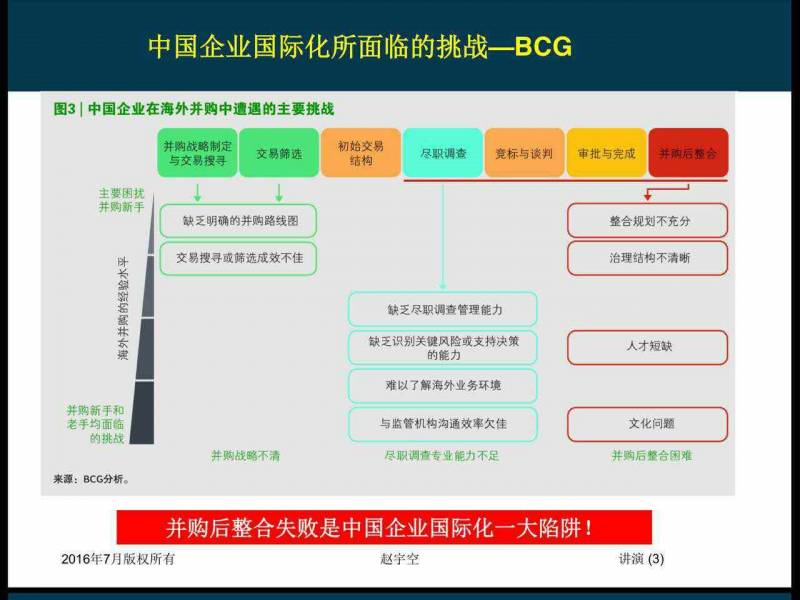 上图是美国著名的波士顿图表,描述中国企业在海外并购各个阶段面临的不同挑战。从并购战略制定与交易搜寻、交易筛选,尽职调查方面,都有很大的问题。最右一栏可以看到:整合规划不充分、治理结构不清晰、人才短缺、文化问题等种种挑战。