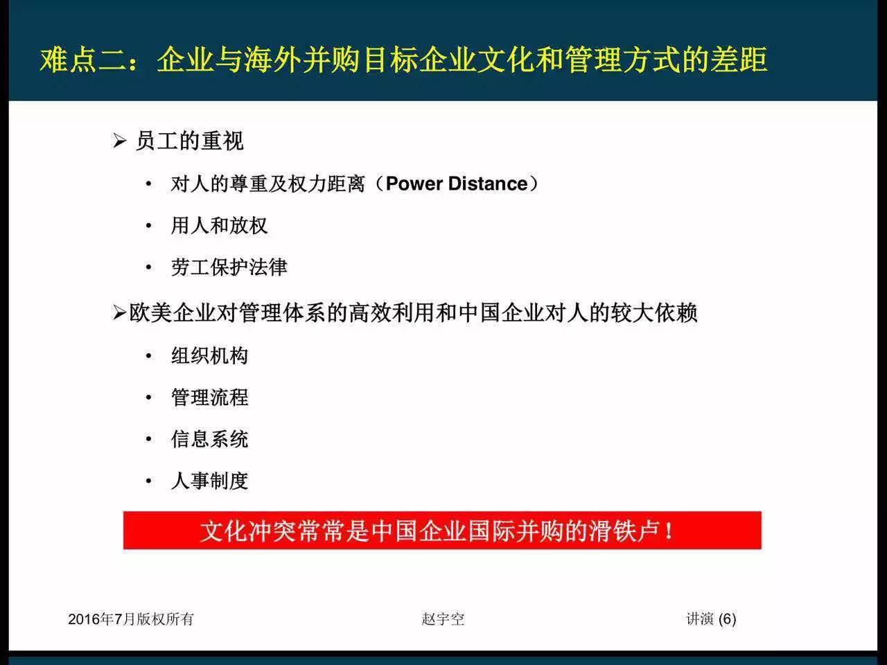 某公司兼并一家德国企业,我们在国内加班加点,把作风带过去,西方员工受劳工法律保护,根本不喜欢这么做,就导致文化冲突。还有之前提到的文化冲突,对人的尊重等等,都很重要。