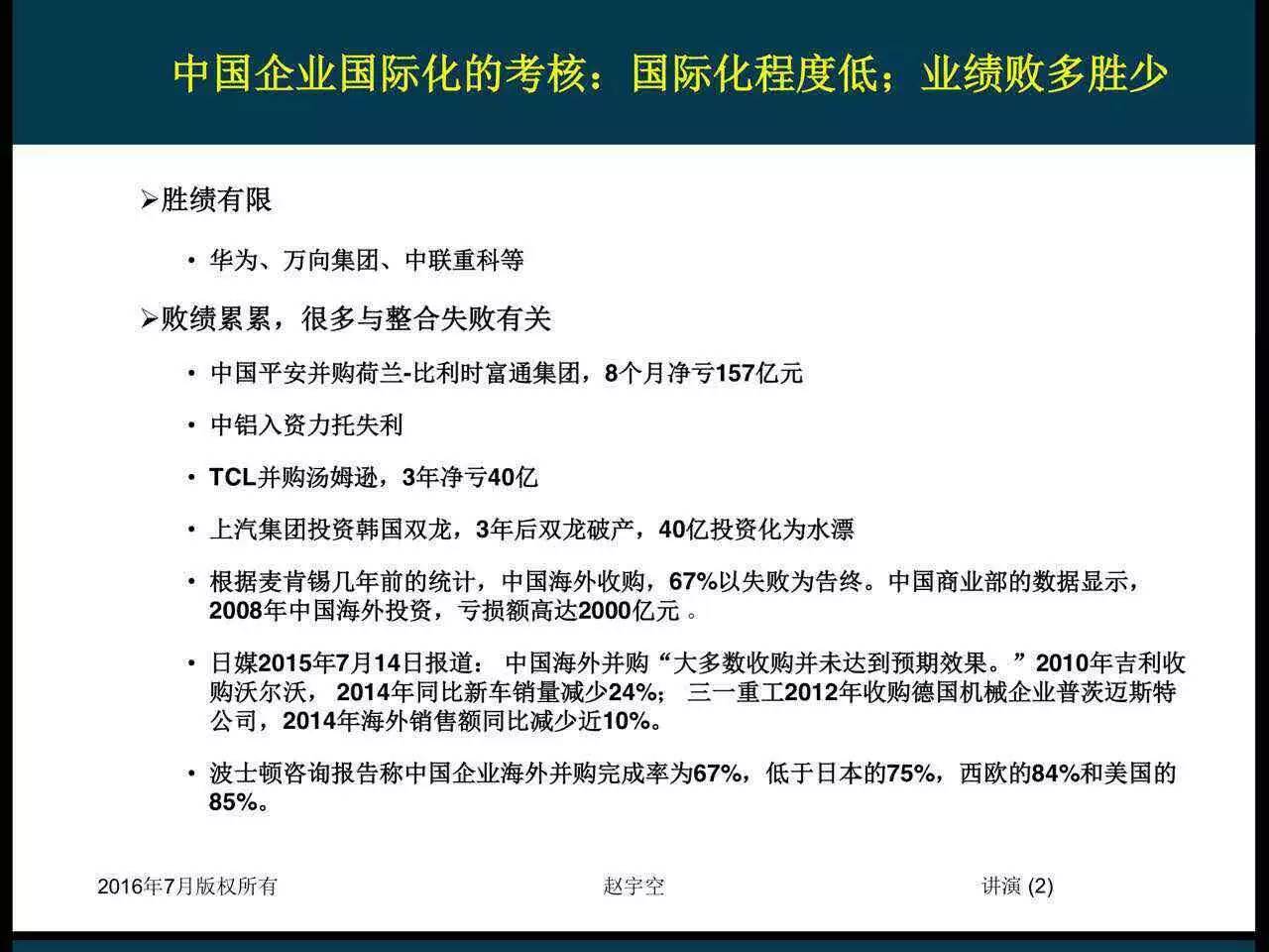 中国企业国际化的起步在最近十到二十年,在起步过程中,可以说成绩有限。像华为、万向集团、中联重科等公司成果颇丰,例如华为有70%海外收入,服务世界20亿人口,其国际战略也做得很好。但在国际化失败的案例也很多,例如TCL并购汤姆逊,3年净亏40亿;上汽集团投资韩国双龙,三年后也是亏损40亿,这些很大程度与整合失败有关。