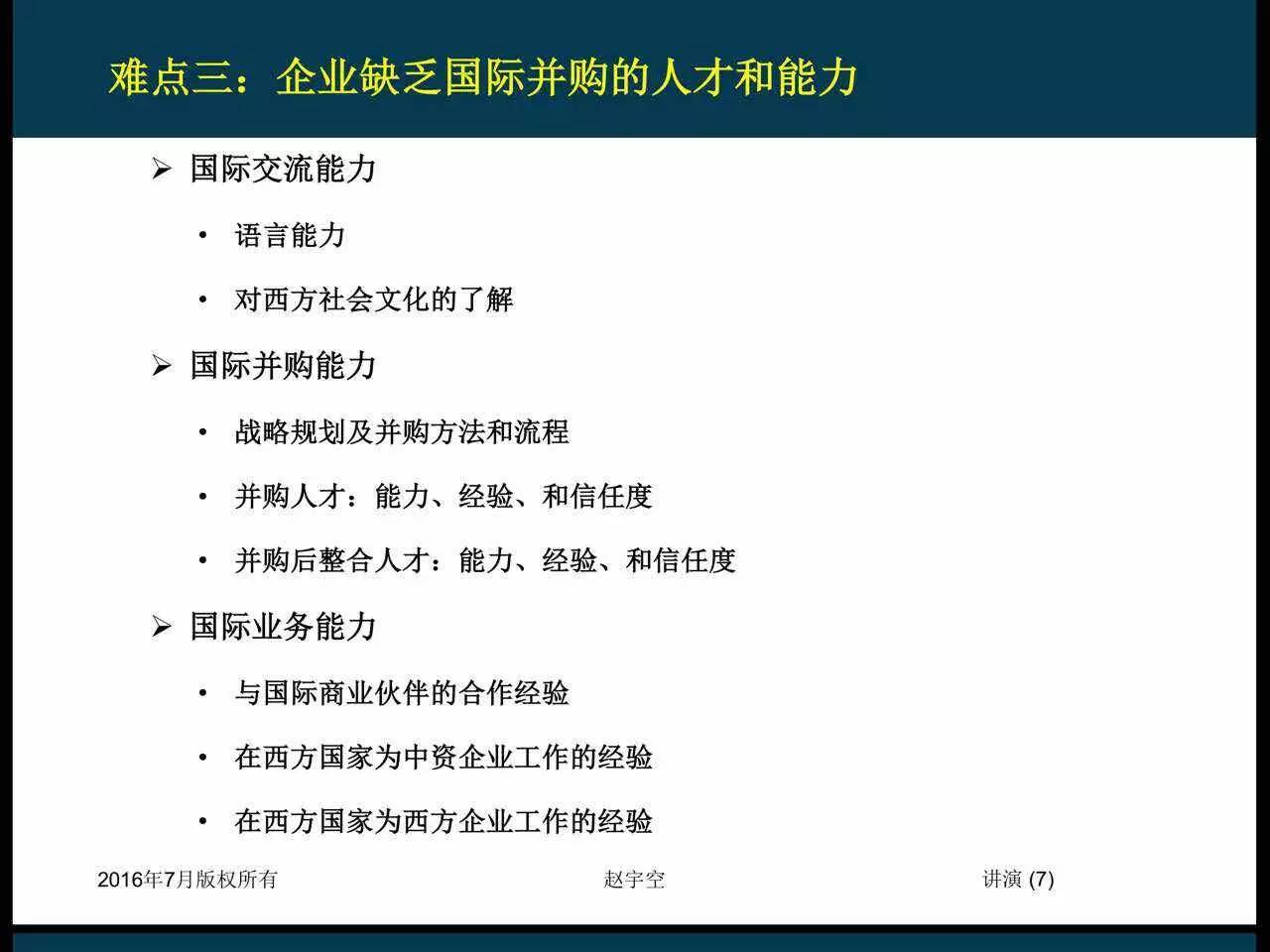 最著名的例子就是TCL王牌彩电并购汤姆逊,基本没有懂欧洲市场的经营人才,整合也没有经验,却举步进行大量并购。要考虑是否有国际交流能力,是否有语言能力,是否了解西方文化,除了谈业务,跟西方高管打高尔夫时是否有共同分享的话题,能否建立合作关系。虽然不能强求有很多共同点,但至少对文化要有所了解。