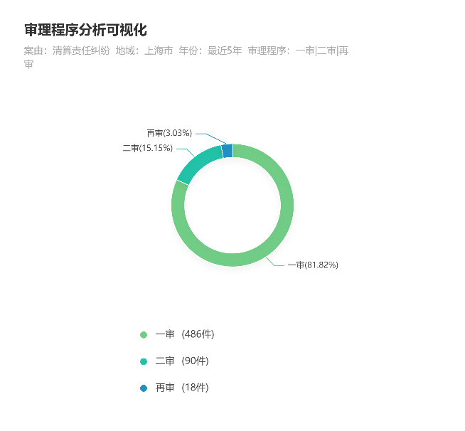 如图 1-4 所示,上海地区公司清算责任纠纷案件程序主要集中在一审阶段(共 486 件,占比 81.82% ),说明大部分纠纷在一审阶段可以得到有效解决。