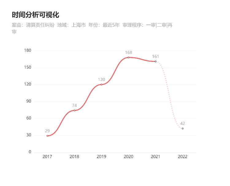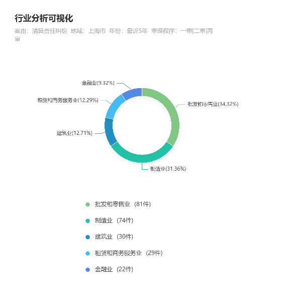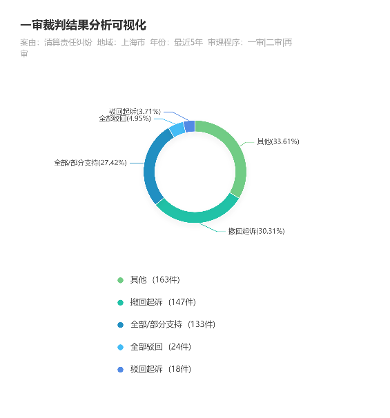 作者:张长越 单位:上海申骏律师事务所 高级合伙人 联系方式:13916627042(微信同号) 作者:沈智雯 单位:上海申骏律师事务所 律师 联系方式:13917165171(微信同号) 股东有限责任和公司法人独立是现代公司法制度下的两大基石,是指股东以其认缴的出资额为限对公司承担责任、公司以其全部财产对公司的债务承担责任。原则上,股东、公司、债权人人格相互独立。 实践中,从公司设立到清算阶段均存在股东任意突破有限责任的界限,滥用公司法人独立地位和股东有限责任逃避债务的行为,致使外部债权人权益受损。 本文中,笔者拟以股东在公司清算阶段的清算责任为研究落脚点,通过上海地区近五年的清算责任纠纷案件,分析股东不履行或不当履行清算责任的各种情形及法律后果,为债权人主张权利提供参考和借鉴。 检索条件 数据来源:Alpha案例库 检索时间:2022 年 8 月 18 日 案由:清算责任纠纷 地域:上海市 年份:最近 5 年( 2017 年至 2022 年) 数据筛选:利用Alpha案例库检索工具,按上述检索方法进行检索,获取了 594 份裁判文书。 一、案例大数据分析 1、时间分布 图1-1 如图 1-1 所示,上海地区近五年公司清算责任纠纷案件数量呈现倍增的快速增长趋势,而 2021 年度、2022 年度的案件数量有所回落可能是因为审理周期原因导致部分案件尚未公布。 整理而言,公司清算责任纠纷案件数量的逐年上涨说明债权人的法律意识逐步增强,开始穿透公司法人独立人格进而依法向公司股东主张权利。 2、 行业分布、标的额分布