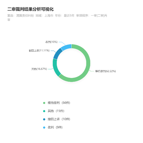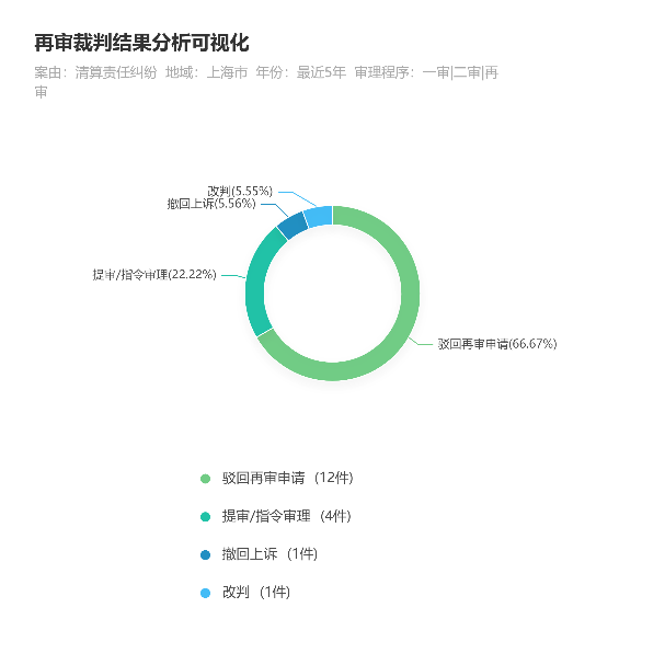 如图 1-5 所示,上海地区近五年的公司清算责任纠纷中约有 30% 的一审案件由原告撤诉,约 5% 的一审案件经审理后驳回原告的全部诉讼请求,约 27% 的一审案件经审理后支持原告的全部/部分诉讼请求,可见债权人提起该类诉讼案件的胜诉率不高。如图 1-6、1-7 所示,上海地区近五年的公司清算责任纠纷的二审改判率约为 10%、再审改判率约为 5.55%。因此,债权人仍需在一审阶段选择正确的诉讼策略,以争取相关人员为公司债务承担责任,增强债权实现的保障。