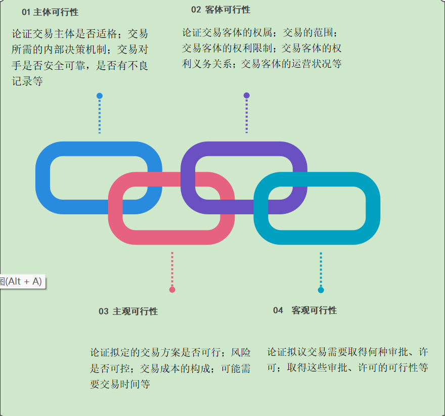 开展尽职调查重点关注以下几个角度:主体可行性;客体可行性;主观可行性;客观可行性。