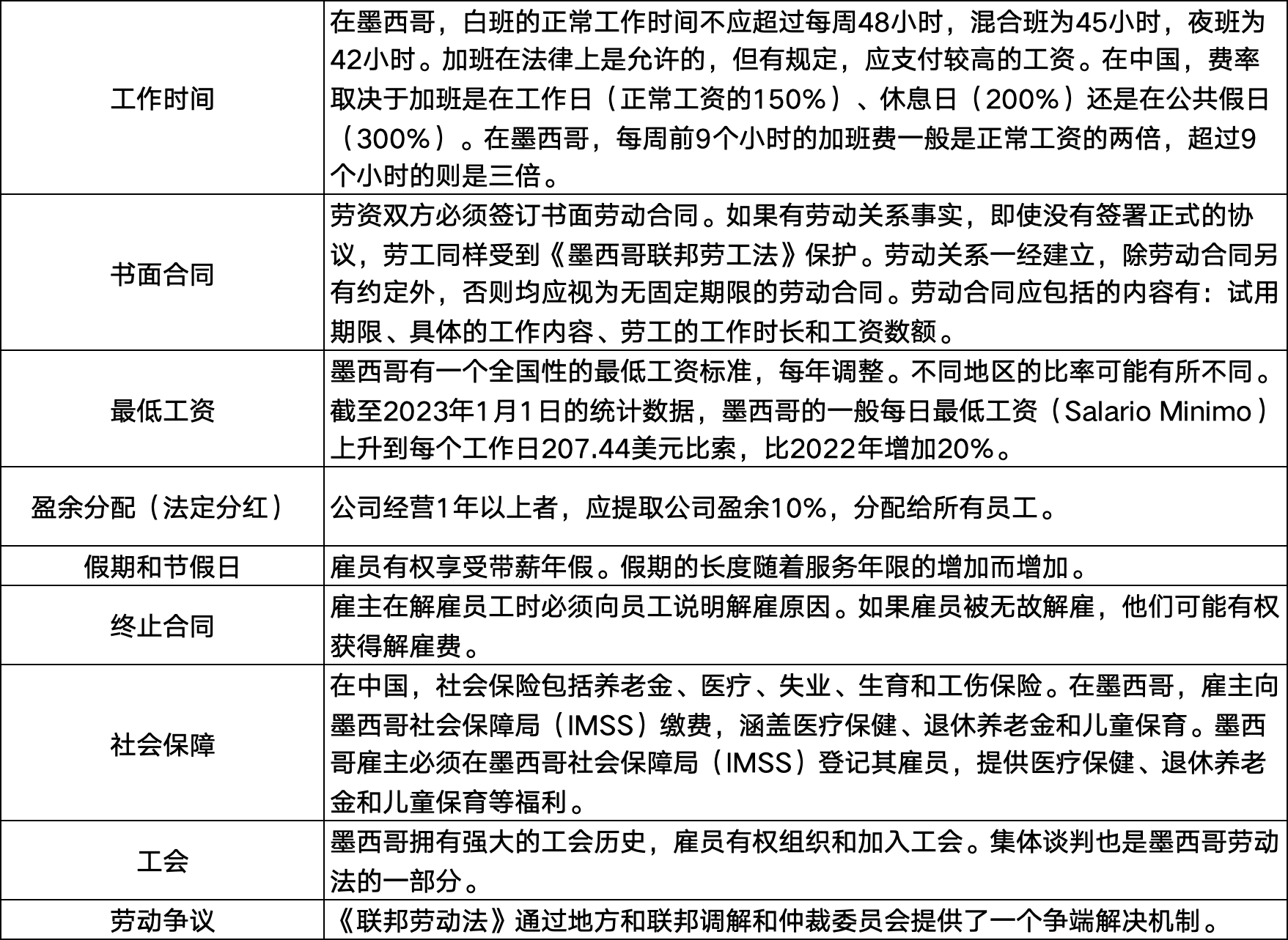 在墨西哥,劳动力成本低廉并不等于不受管制。墨西哥劳动法主要由《联邦劳工法》(Ley Federal del Trabajo)定义,具有丰富的历史,并以其对工人权利的有力保护而闻名。以下是一些关键概念:
