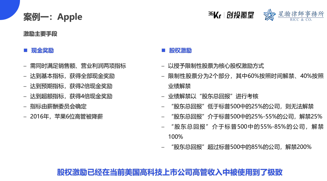 我们知道,Apple核心高管的收入平均在2500万美金以上,而其中的80%都是股权激励收益,现金奖励在15%,基本薪酬仅占4%左右。我们回到最开始的选择题,选项A的稳定性和确定性是最高的;选项B的激励性更高;选项C的发展可能性更大。