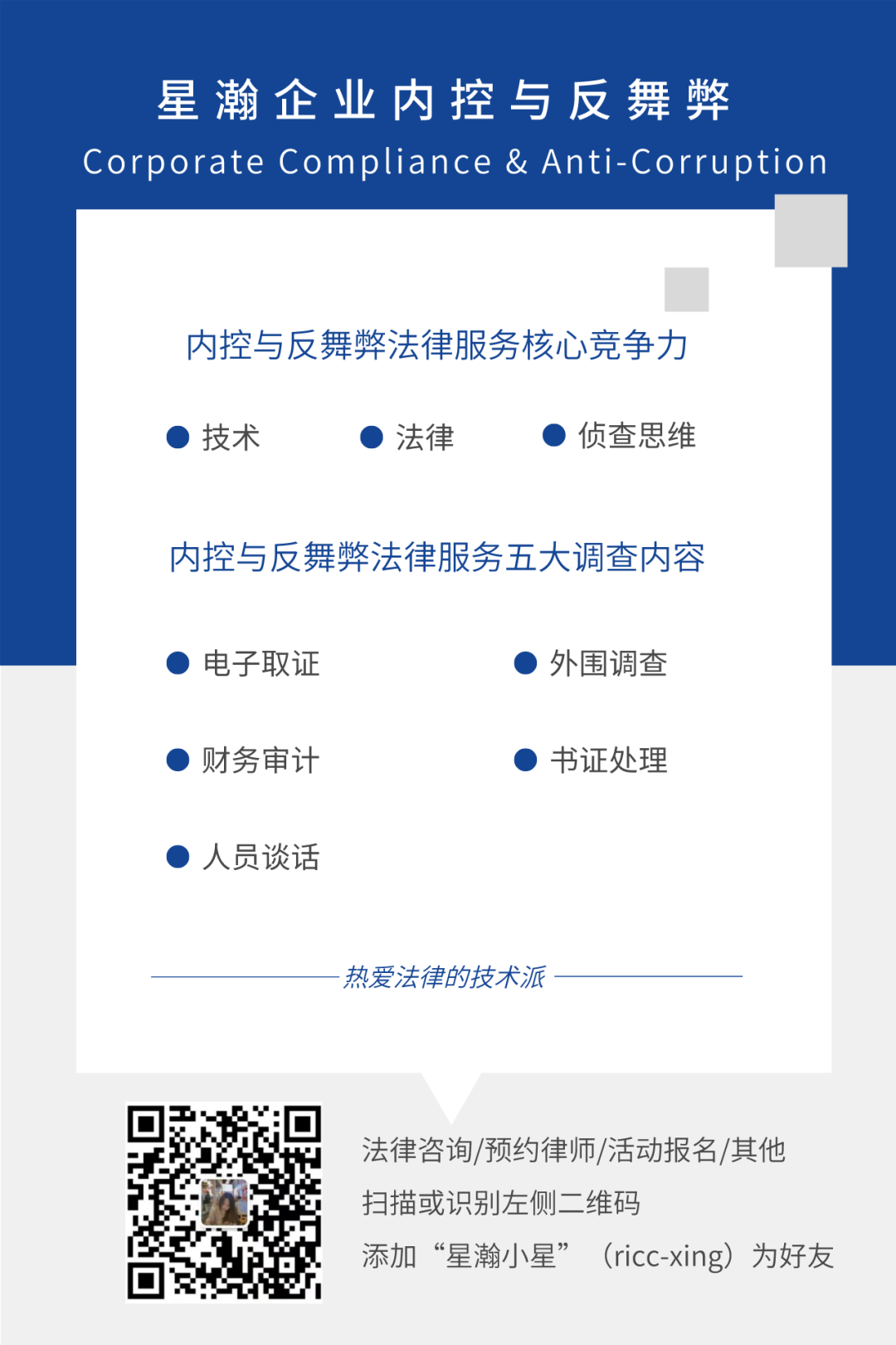 星瀚企业内控与反舞弊法律服务涵盖企业内控体系建设、上市公司内控合规、反舞弊调查、舞弊案件刑事控告、高管/员工损害公司利益民事追索、员工劳动关系处理等,旨在为客户提供专业、高效的内控、合规和反舞弊法律服务。