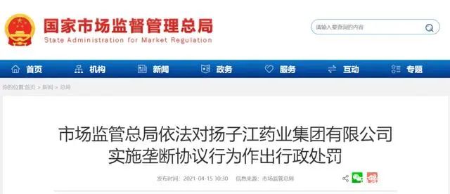 以扬子江药业为例:2021年4月15日,扬子江药业被罚款7.64亿元,但在扬子江药业的处罚清单中并未涉及市场份额的内容。而扬子江药业之所以被罚是因为自身存在纵向垄断的行为。