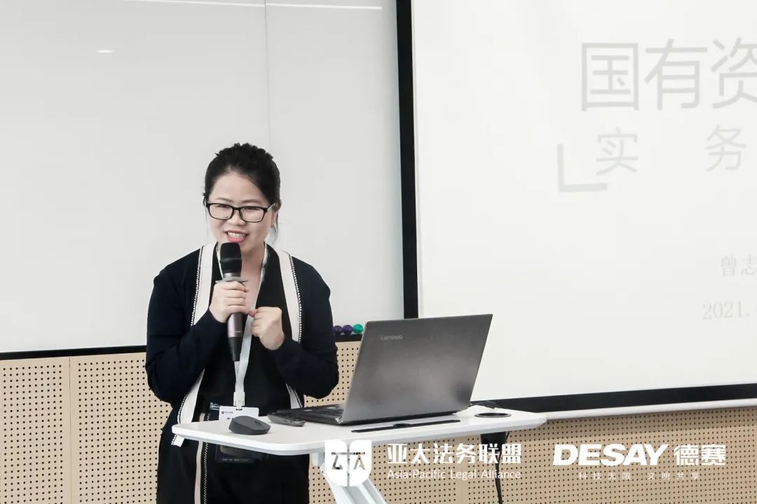 广东德赛集团有限公司法务高级主任曾志娜首先带来了主题为“国有资产处置实务分享”的发言,她从“国有资产及国企改革”“交易主要流程和解析”“实务案例与关注要点”“绿色通道,退出机制”四个方面展开了分享。