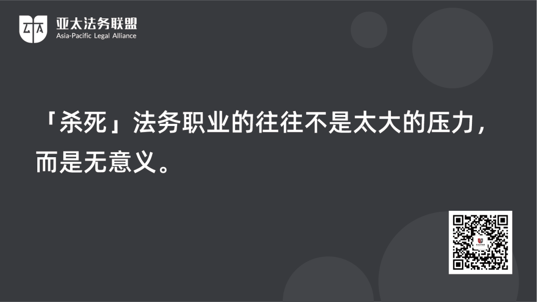「杀死」法务职业的往往不是太大的压力,而是无意义。如果对这样的角色没有兴趣,找寻不到意义,从事法务工作可能会相当的困扰和辛苦。因此,在聂鑫看来,年轻法务人不仅应该有「职业生涯管理」,更应该将兴趣融入到职业生涯的选择中去。因为,法律职业宽门窄路的特性让兴趣导向显得颇为重要。越早解决和认识自己想要什么,探索从事法律职业的缘由,为何而发展和去往何处彼岸这一问题,职业发展才能释放巨大的能量,创造力和深度的满足感。