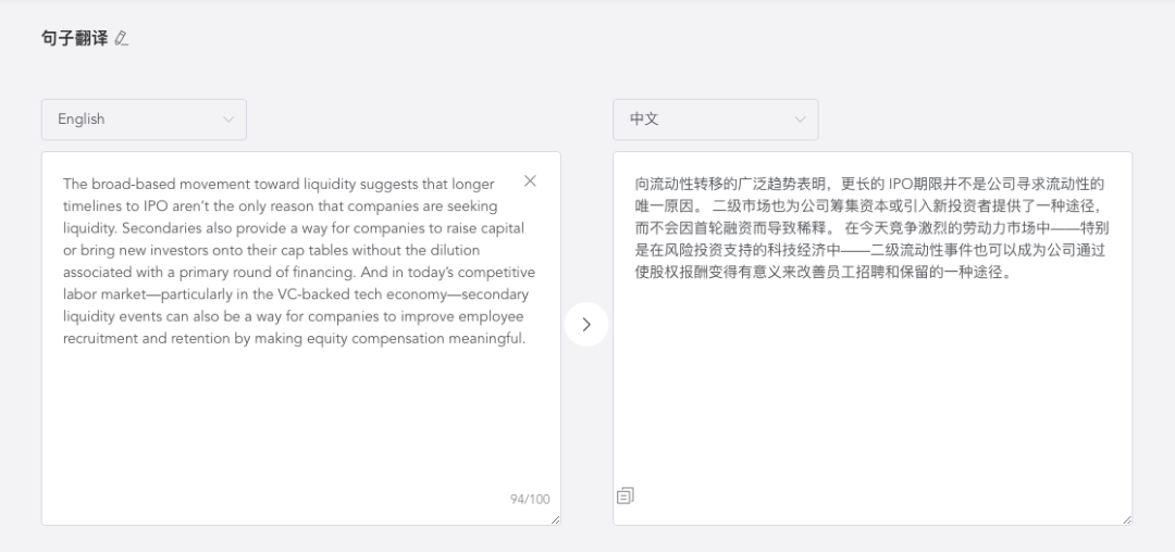 我所在公司「易参」的主营业务是股权服务,本质上是从律师非诉业务中新分化出来的一个分支,与“大而全”的律所相比更为垂直。作为一家仅成立 4 年的创业公司,与成立 10 年以上的律所/咨询公司相比,如何塑造自己的竞争力,我们需要更深的思考。在思考的过程中,我们平时要了解的信息非常广泛,其中外文资料必不可少。最典型的例子,美国创业市场在 SaaS 领域比中国早走了几年,有很多先进经验可以借鉴,而且作为一家具有探索精神的公司,我们要时刻了解美国对标公司的情况,这就涉及大量的翻译工作。尤其是在充斥着大量专业术语的创投圈,需要更加专业的翻译工具支持。第一个工具是 Mac 自带的 Safari 浏览器的翻译功能,很好用。首先它非常便捷,两次点击即可翻译成中/英文,而且比较准确,能够满足绝大多数简单的翻译场景。第二个工具是「飞书快译」,如果你是飞书用户,可以直接使用飞书快译进行翻译,无需跳出飞书。而且由于飞书是字节跳动开发的协同办公平台,最早用于支持字节的全球化协作,经过多年的迭代,翻译结果已经很准确,通常我会使用这个应用对目标内容进行翻译。第三个工具是更专业、更垂直的翻译产品,当我遇到前述两个工具翻译不够准确的内容时,我就会使用这些产品交叉验证 —— 秘塔 AI 翻译(fanyi.metaso.cn)就是其中之一。「秘塔 AI 翻译」是一款专业的 AI 翻译工具,据了解每分钟可翻译 6 万字,翻译后文件格式也可以完全保留,能够节省大量工作时间。首先,秘塔翻译的机器学习已经卓有成效,其翻译质量已经能够满足大多数专业翻译场景。其次,秘塔翻译目前聚焦于法律行业,对于需要翻译的法律事务,如涉外律师业务或者拿来学习外文资料,也能够达到很好的效果。此外,秘塔翻译还支持「自定义术语」,这是因为机器仍然可能不清楚目标翻译内容所在的语境,因此可能需要人工来校准。