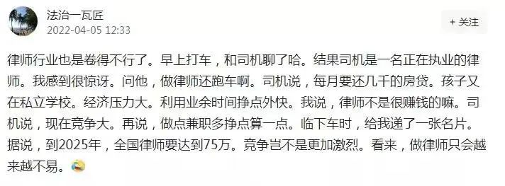 在上海执业5年的L律师,来自包邮区的富庶小城,是家中的独女。刚刚开始独立出来不久,她努力工作,去年一咬牙买了房,把首付付完,所剩寥寥。但是她内心还是充满喜悦,业务蒸蒸日上,远离父母的唠叨,单身的日子也会过得很逍遥。没有想到,今年一波又一波的封控,一片行业一片行业的凋零,业务急转直下。一下子房贷、房租、社保、生活费,就把她压的喘不过气。本想熬过一段时间,但是……最后,不得不求助父母,却被母亲铺天盖地抱怨起来:当初让你进国企,你不去,非得去上海!去上海也就罢了,让你快点找对象结婚,给你介绍那么多,你爱理不理的,现在都没有人给你分担!她告诉我,钱也不会问父母要了,把房子挂出去,故乡是不想回了,公务员也不可能的,就让自己在上海把律师这个职业终老吧!小W律师,在西部的X城,结婚不久,本准备今年要小孩。他主要做政府法律服务,虽然钱少,但是胜在稳定,这样的日子过得也还好。没有想到,今年突然一堆大所杀进政府法律服务的市场,别人要钱还少,关系还硬。好不容易留了几个基层政府的客户,没想到,下半年开始政府给的越来越少,而且还拖欠不给。去问好几次,zf也没有钱,自己也不好意思再开口去要。收入越来越少,老婆的抱怨越来越多。他倒是思想很活络,偷偷注册了滴滴平台,在休息时间能够跑车赚外快。他对我笑着说:你还别笑,我可以边开车边给乘客做法律咨询,妥妥网约车中的董宇辉,也许还带来案源呢!他回复我:车没跑了,我去一家国企当法务了,钱不多,但稳定,至少婚姻保住了。这只是两个小小的故事。