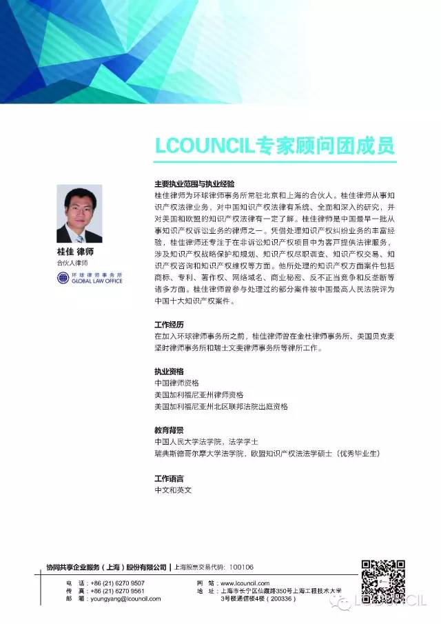桂佳,环球律师事务所合伙人律师 本期人物档案LCOUNCIL专家顾问团 知识产权顾问桂佳合伙人律师环球律师事务所桂佳律师为环球律师事务所常驻北京和上海的合伙人。桂佳律师从事知识产权法律业务,对中国知识产权法律有系统、全面和深入的研究,并对美国和欧盟的知识产权法律有一定了解。 律师风采 2022年08月20日 0 点赞 0 评论 4389 浏览