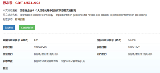 2023年5月23日,国家市场监督管理总局、国家标准化管理委员会发布了GB/T 42574-2023《信息安全技术 个人信息处理中告知和同意的实施指南》(下简称《实施指南》),并将于2023年12月1日起开始实施。