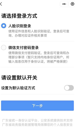 不得以“与其他授权捆绑”“不点击同意就不提供服务”的方式强迫或变相强迫作出的同意,否则该同意无效;设置的拒绝选项不应存在视觉误导,例如同意选项显而易见而拒绝选项难以识别或无法点击;提供替代方式供用户选择以满足自愿性的要求,用户可通过输入密码或验证码等方式继续使用某项服务功能,保证用户做出“同意”的自愿性,这点我们可以参考“粤省事”小程序上面的页面设置: