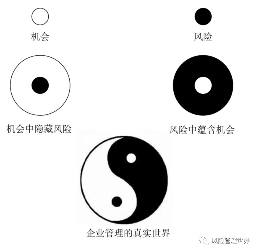 为了更好的从机会和风险的对立统一性上来定位风险,我们再用一张图形容企业管理中机会和风险的关系:机会中隐藏着风险,风险中蕴含着机会,也许这才是企业管理的整体画面。
