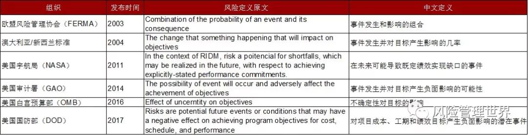除了ISO和COSO的定义外,全球重要组织的近年来发布的典型风险定义如下表所示: