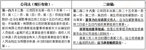 二審稿規定董事為清算義務人,清算組一般也由董事組成,但也留了個口子,章程或股東會決議另選他人的除外。